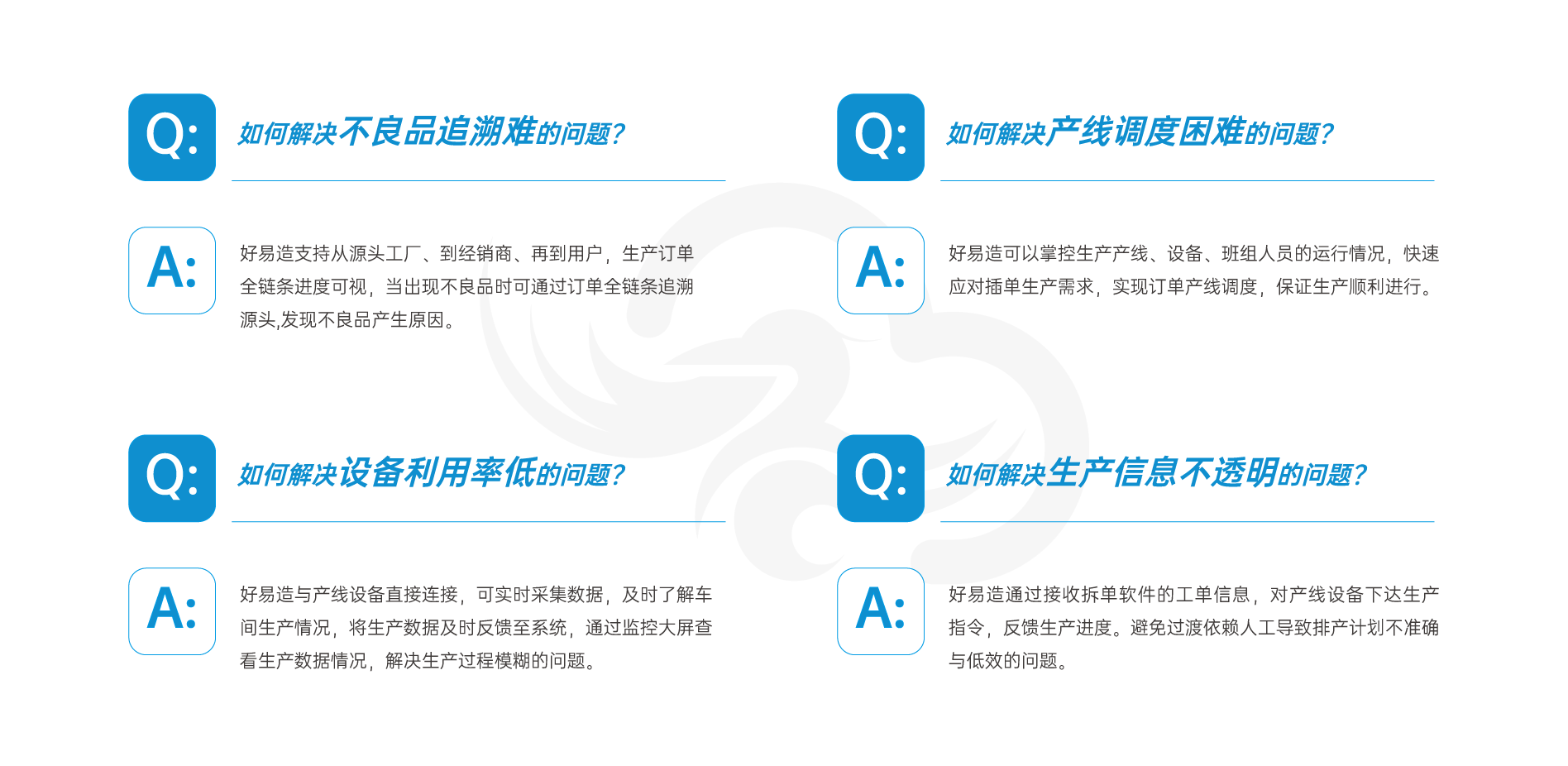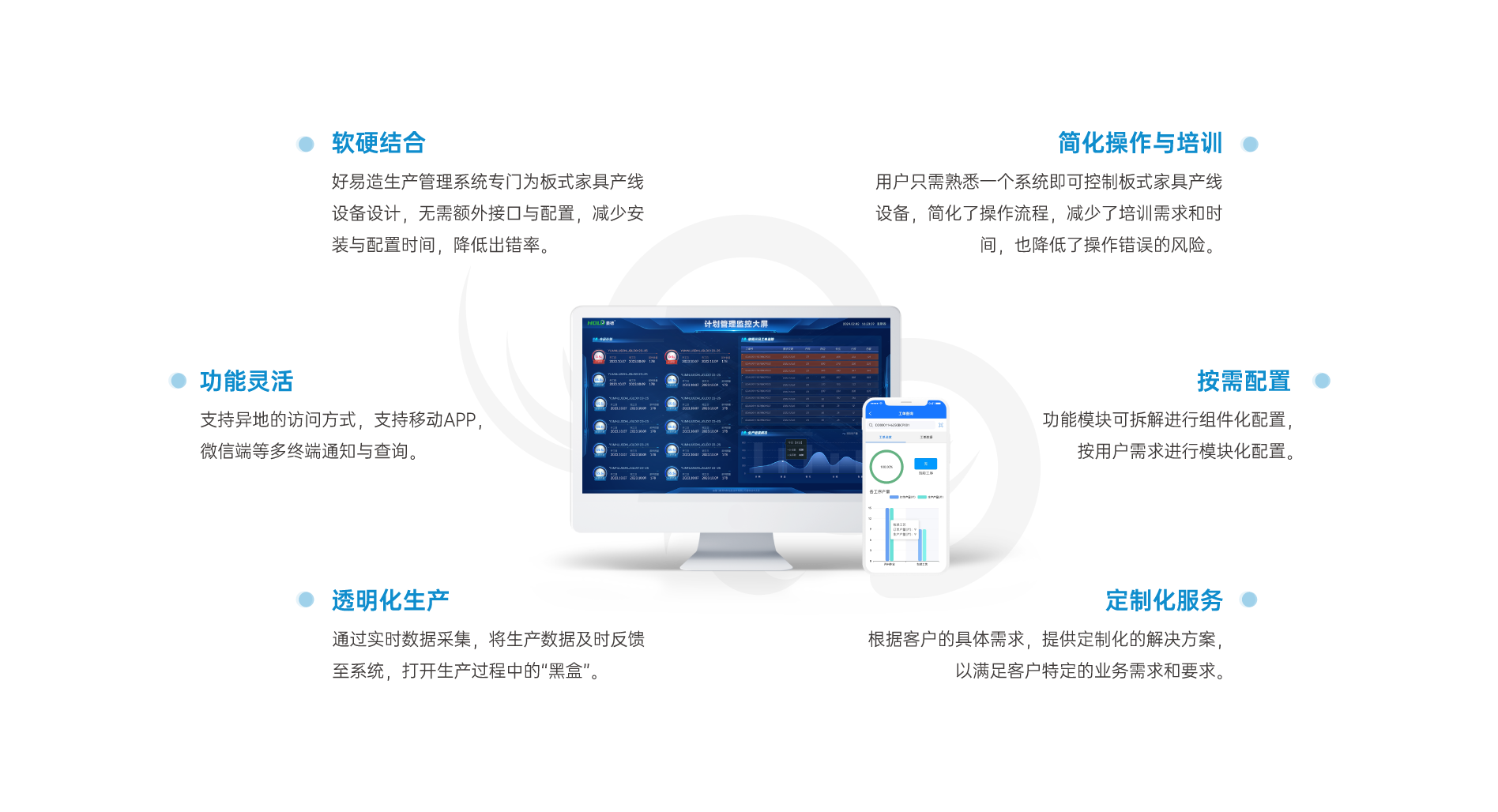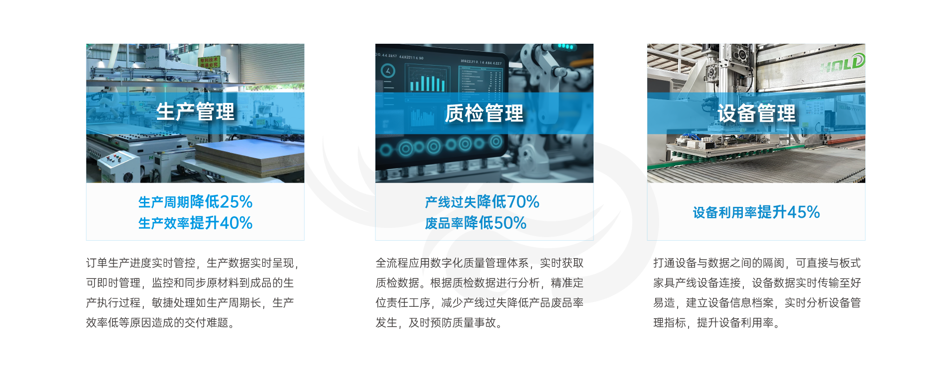 好易造结合豪德设备为板式家具生产企业提供生产运营系统,处理车间自动化控制系统“信息孤岛”问题,通过对即时生产数据采集,达到对生产现场的实时控制,以及为管理层提供精细的决策支持。
