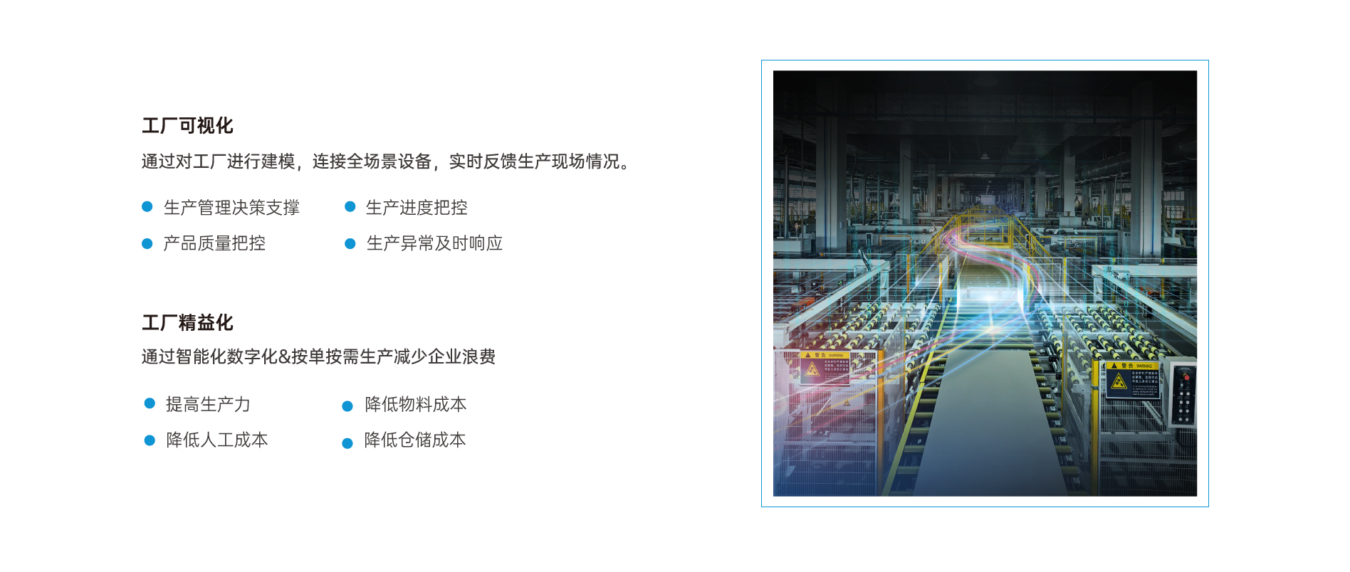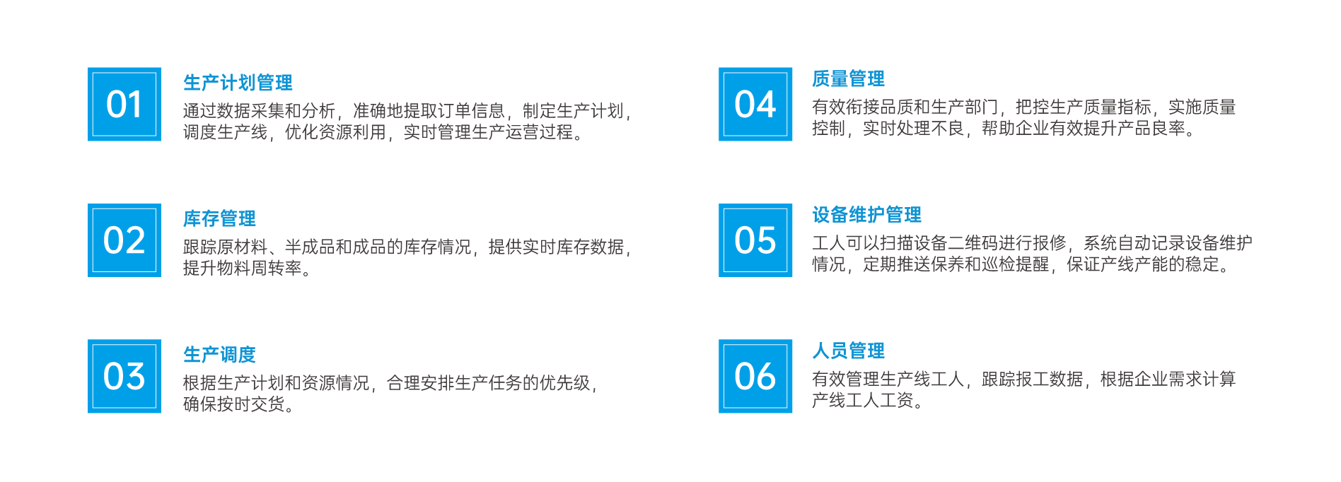 面向泛家居产业,通过边缘终端和配套的SAAS化应用场景,向下接入不同类型终端工业设备,搭建从订单管理、生产管理、设备管理、质量管理、仓储管理等信息一体化运作管理平台。主要聚焦生产制造端、供应链管理端等的数据采集、制造执行、设备健康管理及预测性维护预警等需求,提供数字化转型解决方案。