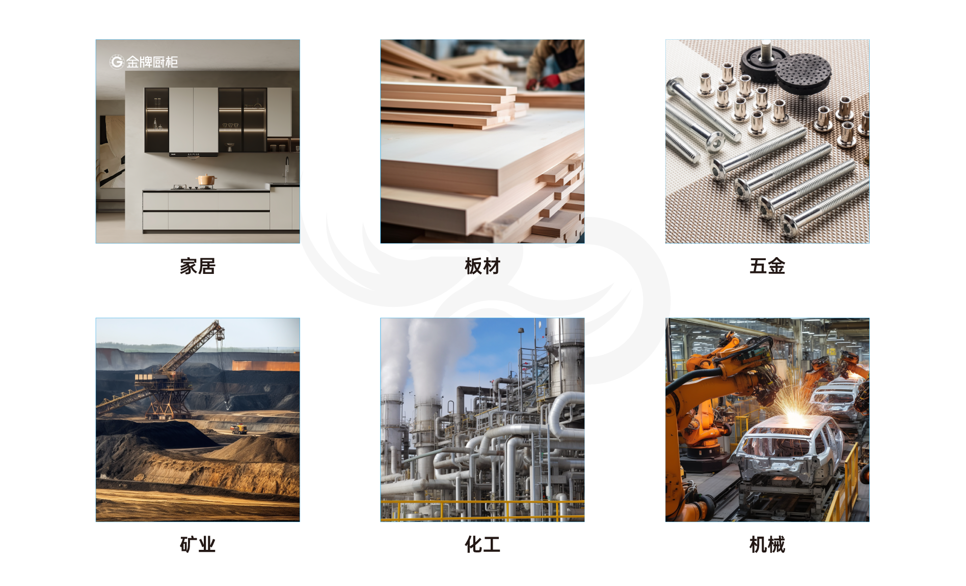 广泛应用于家居、板材、五金、化工、钢铁、机械、电子等重资产型生产企业。