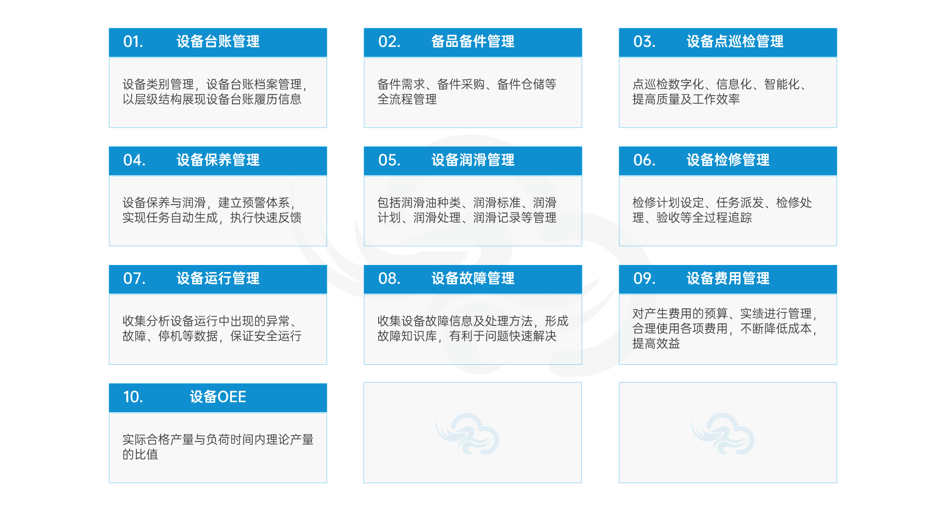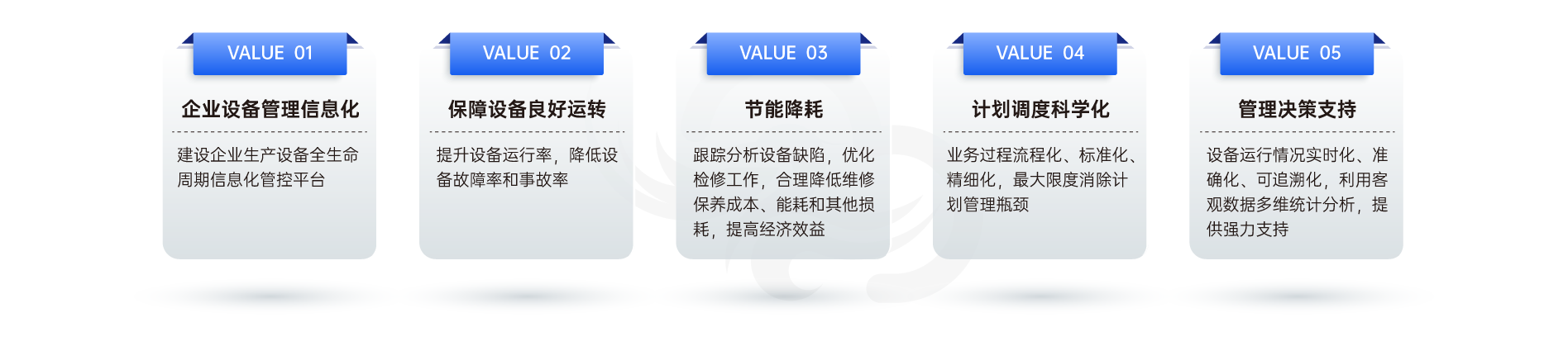 鲲鹭设备全生命周期管理解决方案为企业提供了新型设备管理建设思路。以设备全生命周期管理为核心,设备日常运行管理为主线、设备状态预防性维护为前瞻,建立各过程管理档案,实现设备资产管理与日常运行管理的无缝对接。方案灵活可配置,更加适应流程变更,使设备管理中定性、随机的成分转变为定量、标准及规范的管理,保证了企业对设备物质运动和价值运动全过程实行先进可预知管理,并逐渐实现以OEE为主,提高工作质量、效率和现代化程度,辅助企业的设备管理系统工作决策,最终实现整体经营目标达成。