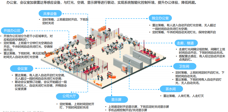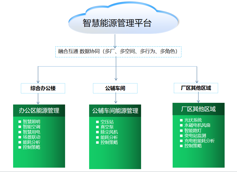 产品方案:办公区照明、空调,公辅车间空压站、风机、真空泵,等能耗数据采集、分析、控制、节能管理。