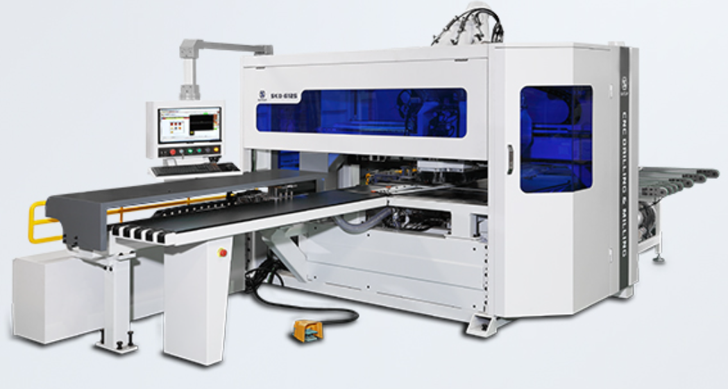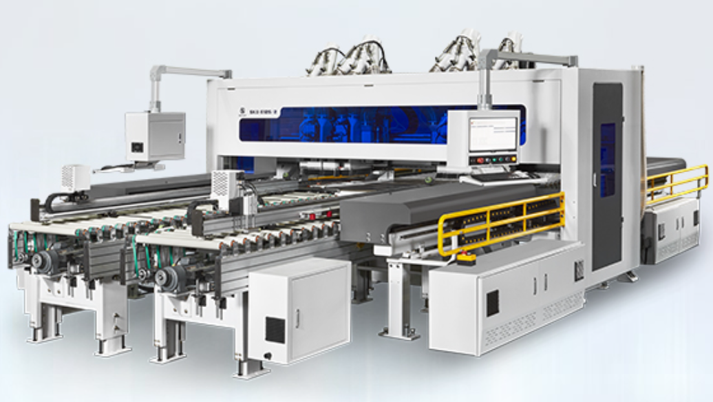 打孔工序多是采用通过式排钻设备,相对较容易实现自动化生产。自动化生产线主要需解决两个问题:一是调节好与上下工序衔接后的生产节拍,可以根据生产情况建立多条并列的排钻线;二是对于不同的板材需要打不同类型的孔,这就得使用不同的排钻设备,主要是指双排钻和多排钻等。