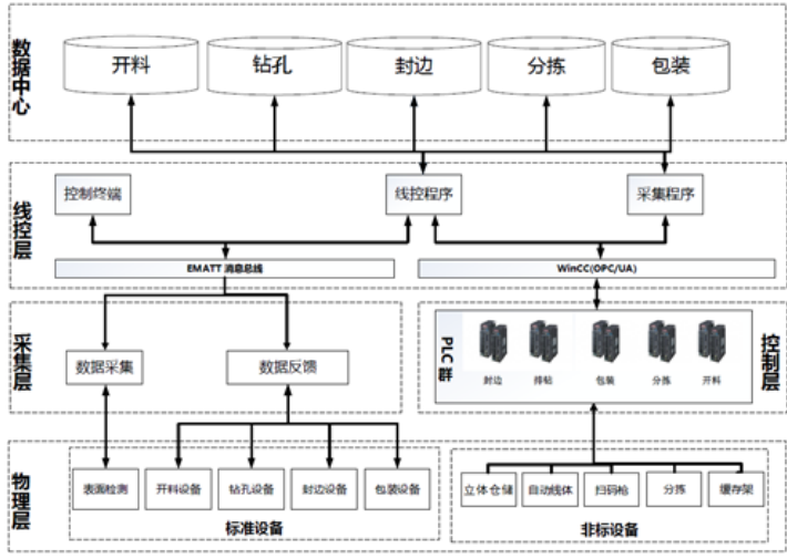 定制家具自动化生产线的各生产设备和硬件单元与控制系统的主要通讯网络如下图所示。生产备料阶段由制造企业生产过程执行系统(MES)准备所有工段生产数据,并下发给车间每个工段的每台设备。