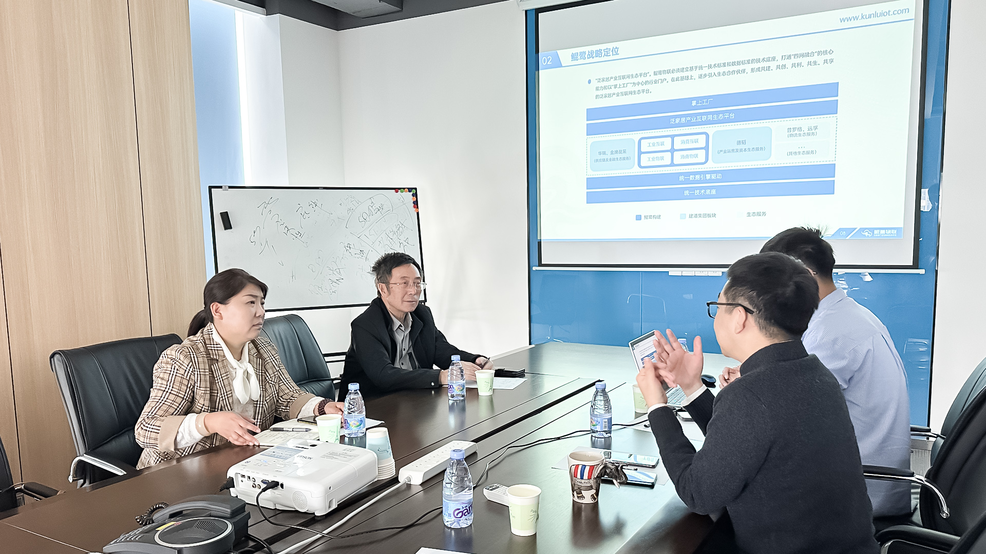 随后双方举行了座谈会。座谈期间,鲲鹭研究院秘书长郭伟鹏就建潘集团泛家居产业互联网生态平台战略布局及鲲鹭物联使命、战略定位、核心能力、产品体系、成功案例等进行了介绍,并着重介绍了基于统一技术底座和统一数据驱动引擎发展泛家居产业互联网四网融合技术生态系统的核心理念。