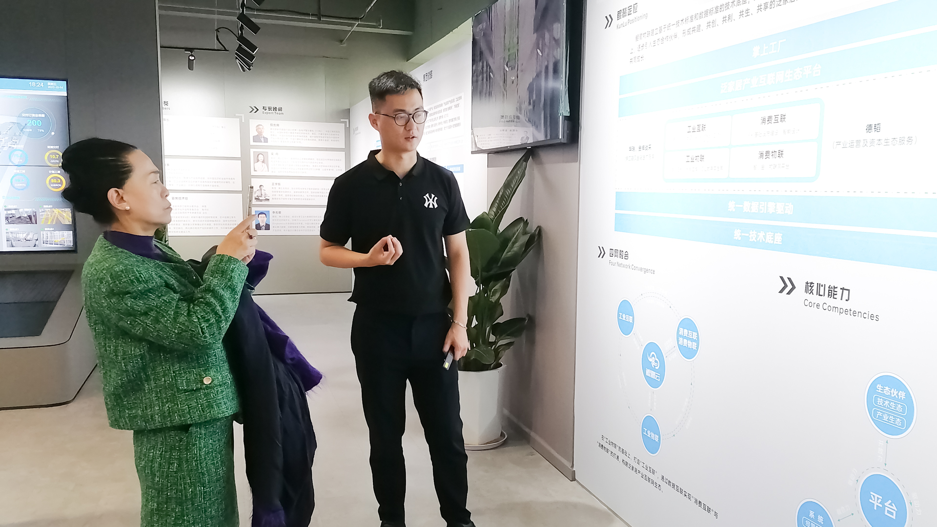 在鲲鹭智能展厅参观期间,研究院郭伟鹏向中国通信工业协会两化融合委员会王萍会长详细讲解了鲲鹭物联基于泛家居产业互联网生态平台构建的战略布局及使命愿景、技术架构、产品体系等内容,赋能智能制造,深化产学研融合,不断促进科技成果转化升级。