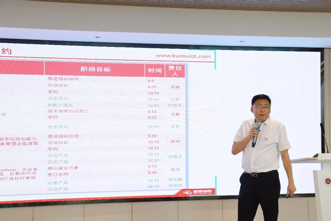 鲲鹭物联商务中心总经理兼销售总监赵华做了项目组百日冲刺汇报,汇报中赵总盘点了各个保签约项目的推进计划节点及相