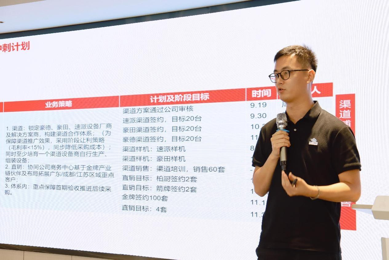 鲲鹭物联产品研发中心总经理任培实汇报了 “1+N” 组的百日冲刺计划及小组分工。“1+N”产品将围绕营销管理和生产制
